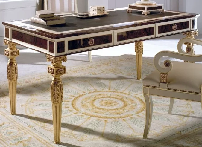 A luxury executive writing desk featuring a leather-inlaid surface, soft-close drawers, and refined brass detailing. Designed for premium home offices.
